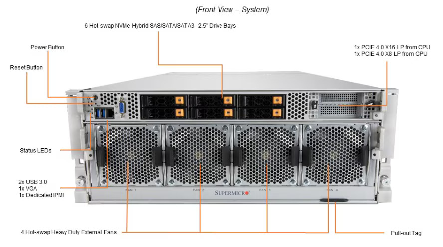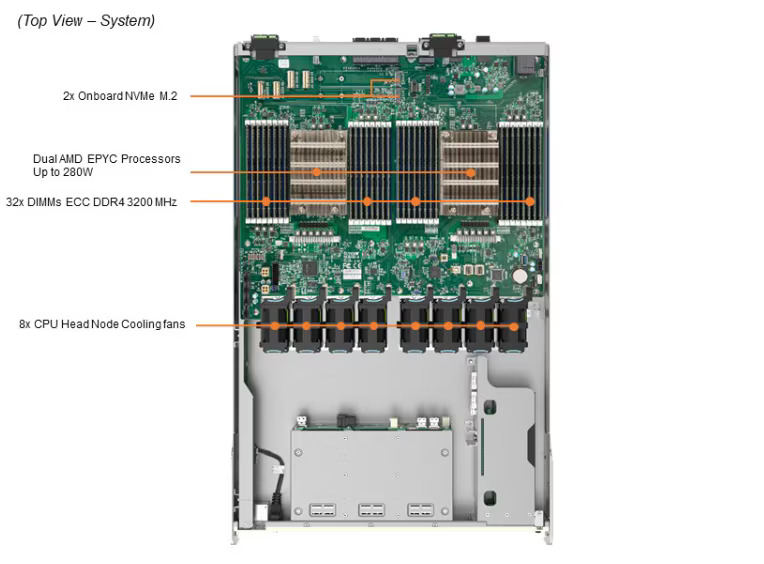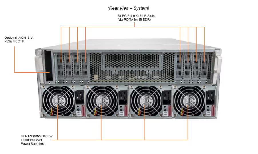 At its core, the AS -4124GO-NART+ features dual AMD EPYC 7003/7002 Series processors with up to 280W TDP (air-cooled), delivering robust parallel processing. Memory capacity scales to 8TB of 3200MT/s ECC DDR4 RDIMM/LRDIMM across 32 slots, ensuring efficient handling of large datasets. Storage includes 6 hot-swap 2.5″ NVMe bays (expandable to 10 with optional rear bays) and 2 M.2 PCIe 4.0 x4 slots for high-speed data access. Expansion comprises 8 PCIe 4.0 x16 slots via PCIe switch, plus additional PCIe 4.0 slots for low-profile cards and AIOM support, with NICs enabling GPUDirect RDMA (1:1 GPU ratio).